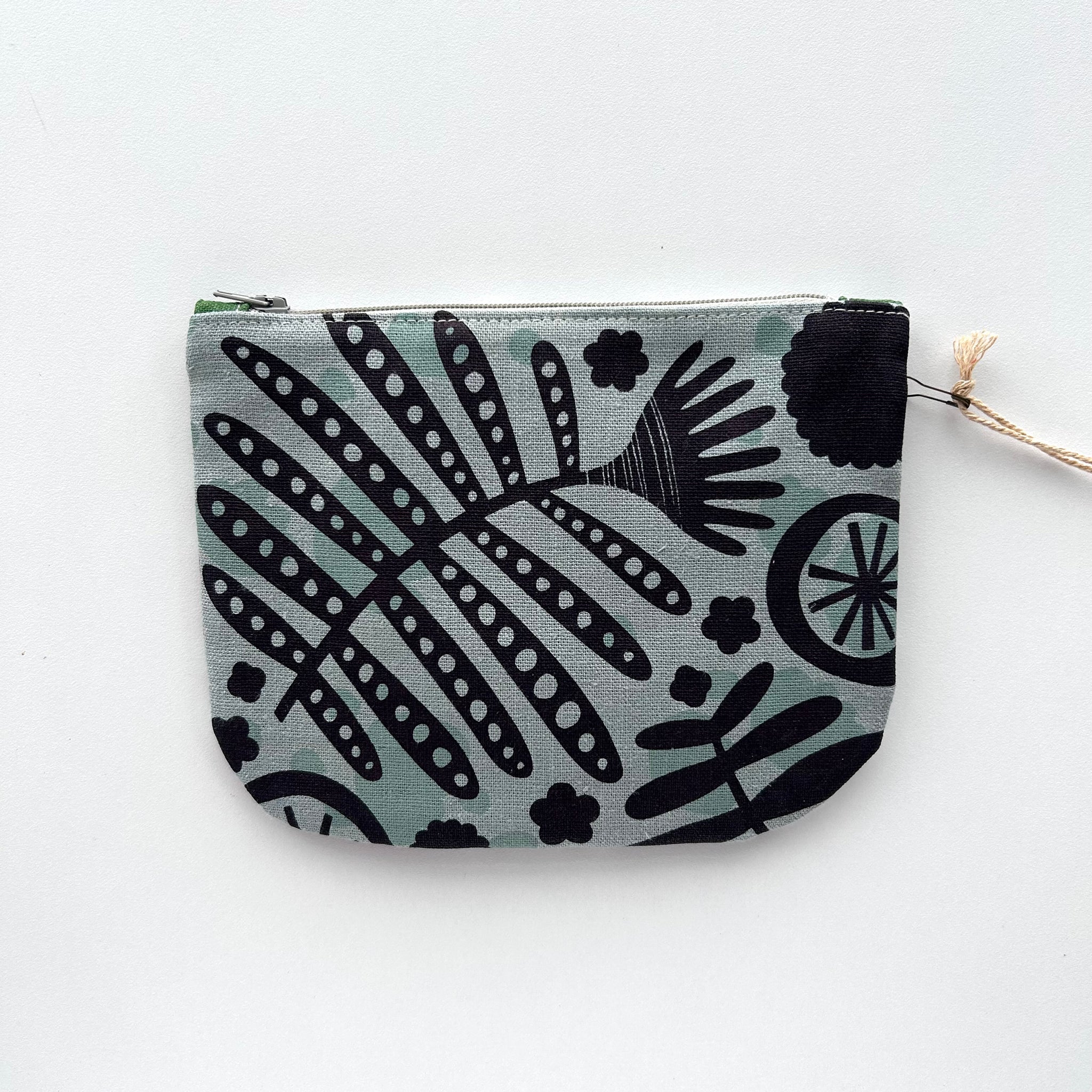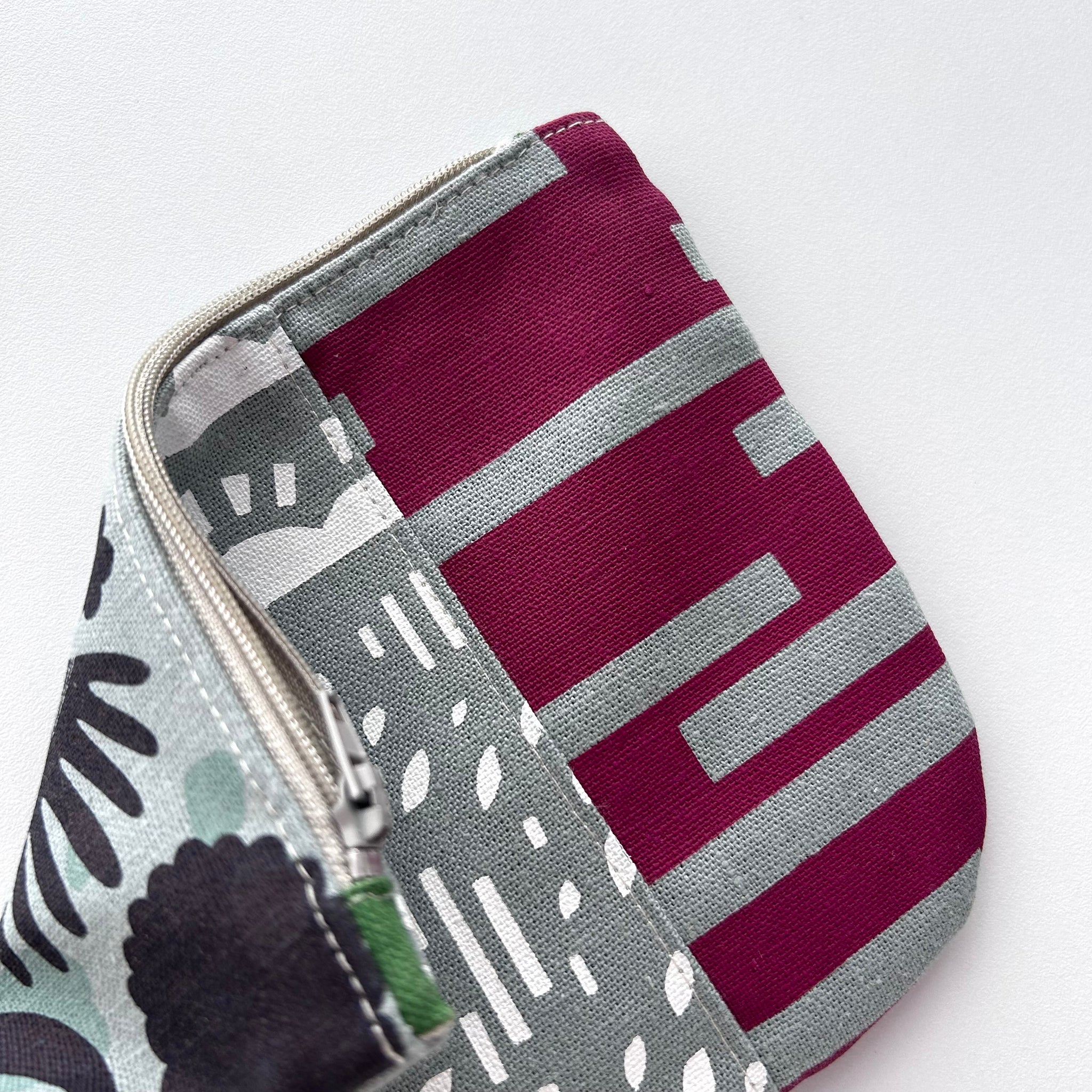 Printed on grey fabric in my original designs in black, magenta and white ink, it's lined with natural linen and the interior is a single compartment.