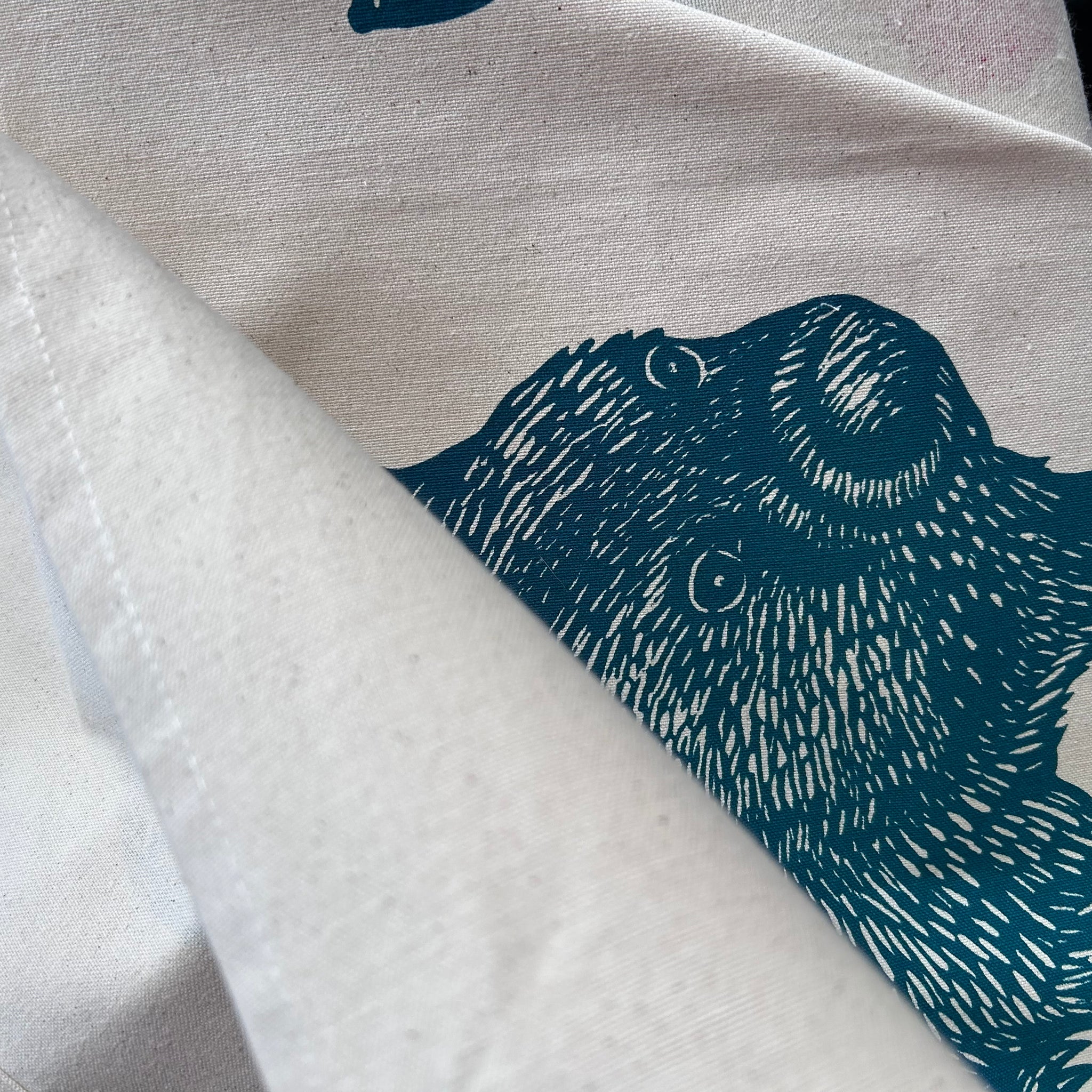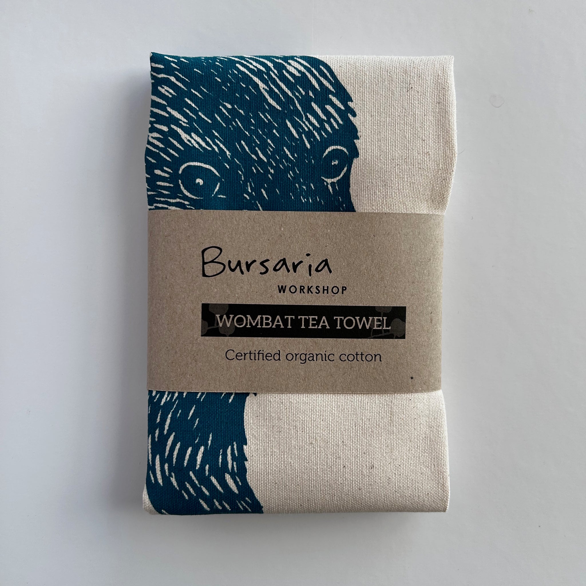 Available in deep turquiose, this original wombat tea towel is printed on GOTS-certified organic cotton using solvent-free inks in my original wombat 'front + back' design.